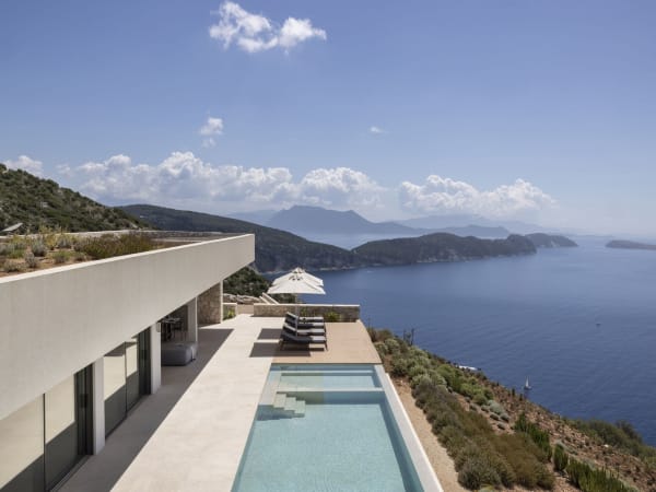 Perched high above the sea on Lefkada's southeast coast, Ortikia boasts extraordinary full-compass vistas, a fabulous infinity pool, superior fixtures and fittings and voluminous, light-filled interiors... all just a short drive from the tavernas and beach of Mikros Gialos!